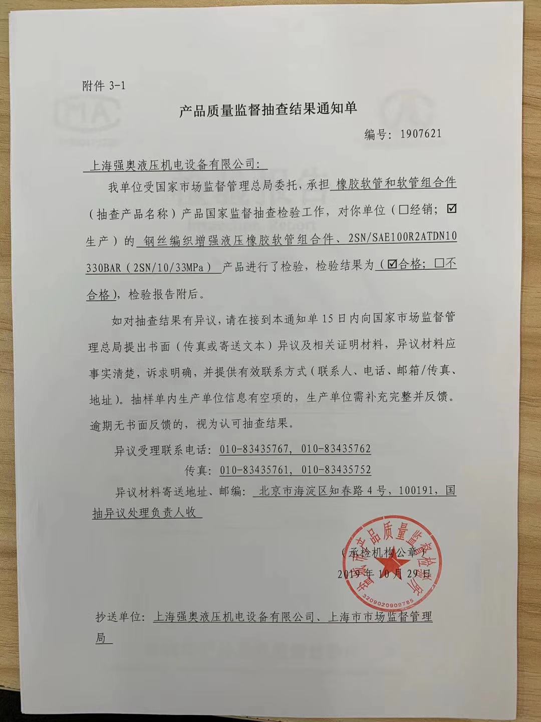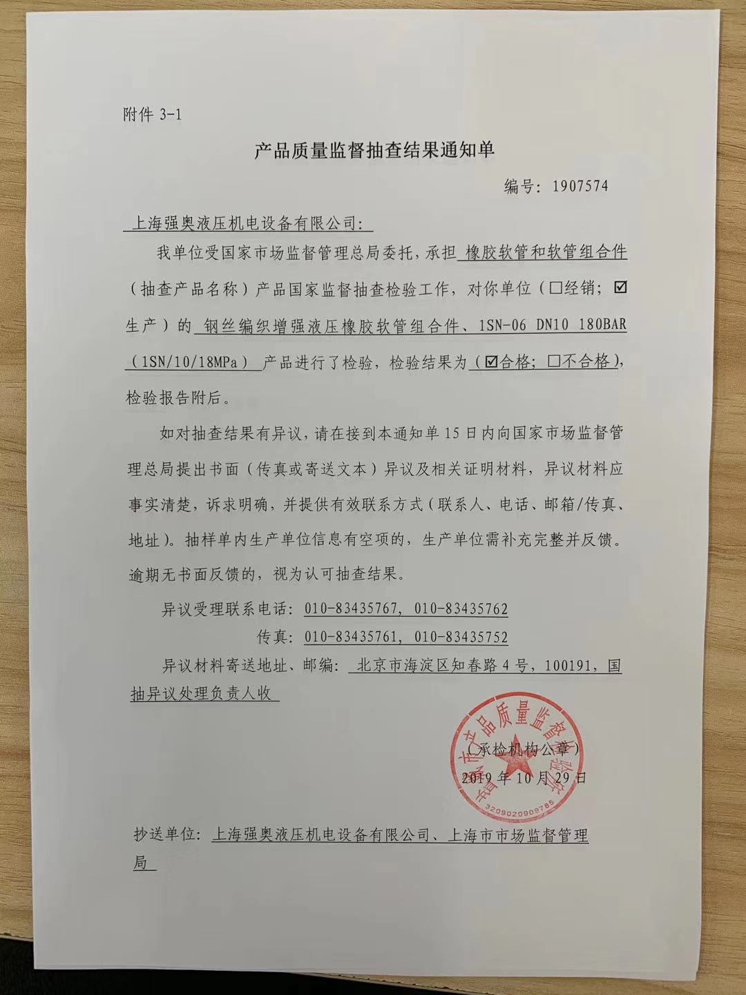 熱烈祝賀 上海強奧液壓機電設備有限公司 于2019年10月29日順利通過 國家市場監(jiān)督管理局 對我司2個批次的產(chǎn)品質(zhì)量監(jiān)督抽查!